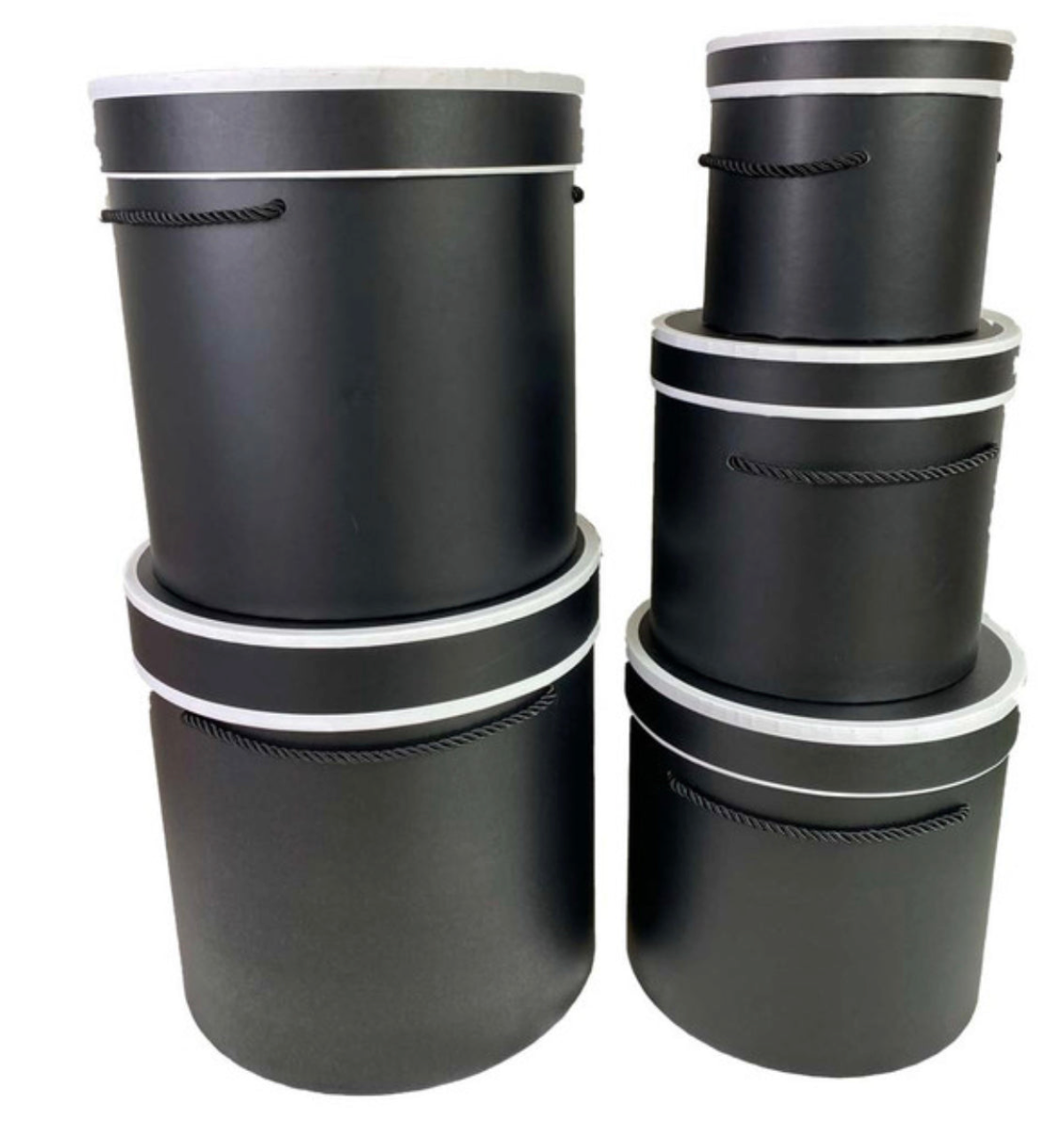 For the extra height needed to really stand out, these tall floral hat boxes tick off the boxes! White, with black accents and decorative rope complete the look! Set of 5 Boxes.